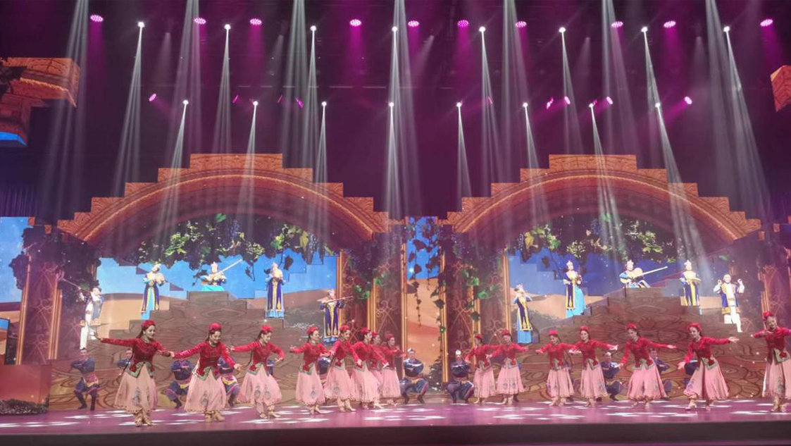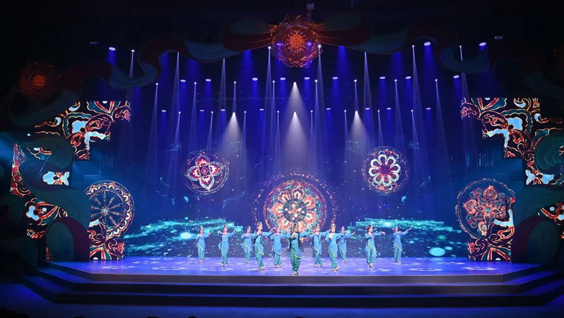 LED屏由深圳聯(lián)錦光電訂制的異形屏,面積280㎡的LED舞臺(tái)背景屏,結(jié)合《龜茲樂舞》 《庫車非遺》的情景畫面,將杏花花海、龜茲壁畫、飛天伎樂等代表龜茲文化的畫面被重現(xiàn)于舞臺(tái),璀璨絢麗,現(xiàn)場(chǎng)燈光時(shí)而幽靜自然,時(shí)而恢弘壯闊,讓觀眾的心情隨著視覺情景的起伏變化而變化,精彩的演出仿佛將我們帶回到千年前的龜茲古國(guó)。