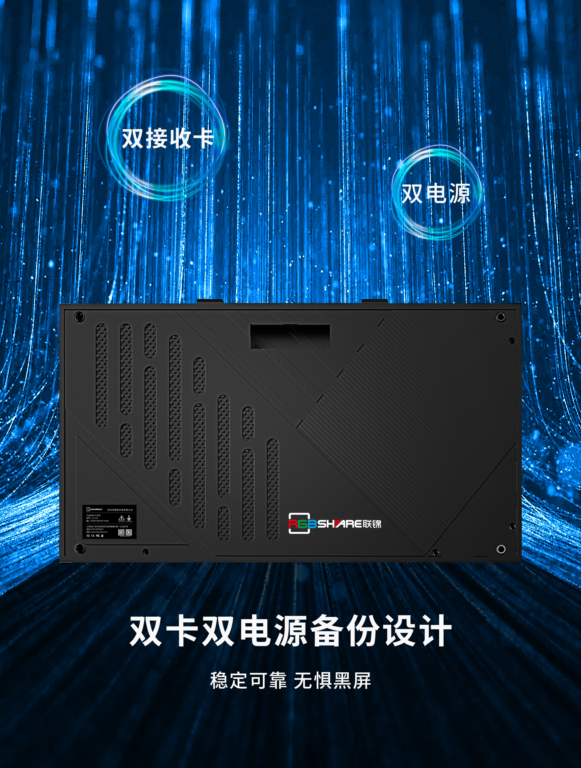 考慮到客戶對產(chǎn)品安全性、穩(wěn)定性、可靠性的嚴格要求,聯(lián)錦LED顯示屏X3系列支持雙卡、雙電源配置,真正實現(xiàn)雙備份,畫面顯示不中斷,讓信息穩(wěn)定傳輸,為日常會議提供切實保障。