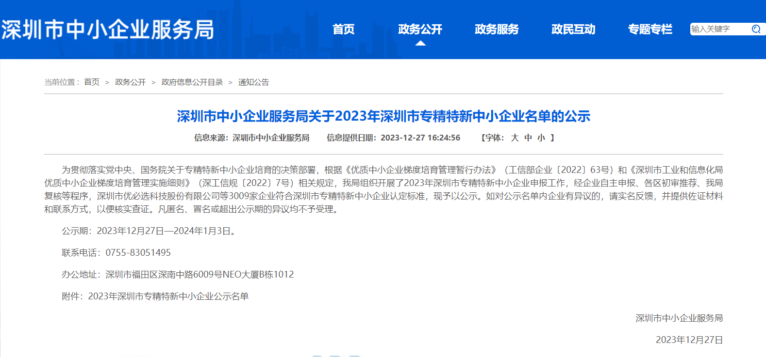 近日,深圳市中小企業服務局官網正式通過了“2023年深圳市專精特新中小企業”名單公示。經過前期申報、初審推薦、政府復核等嚴格程序的遴選,聯錦從眾多參選企業中脫穎而出,憑借在LED顯示領域取得的優異成績以及強大的自主研發與創新實力成功入選,榮獲“2023年深圳市專精特新中小企業”認定。