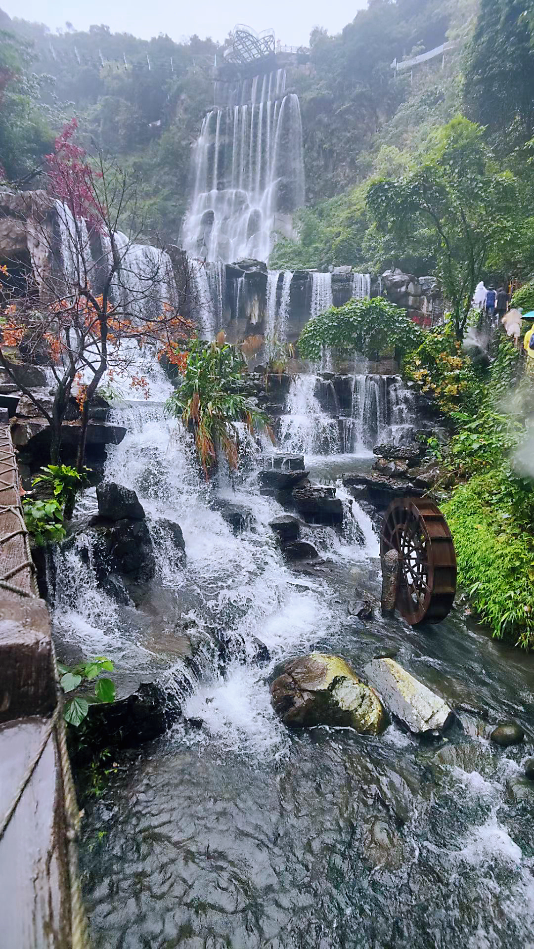 九重瀑布屹立在山谷之中,水幕如銀河飄雪從山峰中飛瀉層疊而下,氣勢磅礴,極其壯觀。