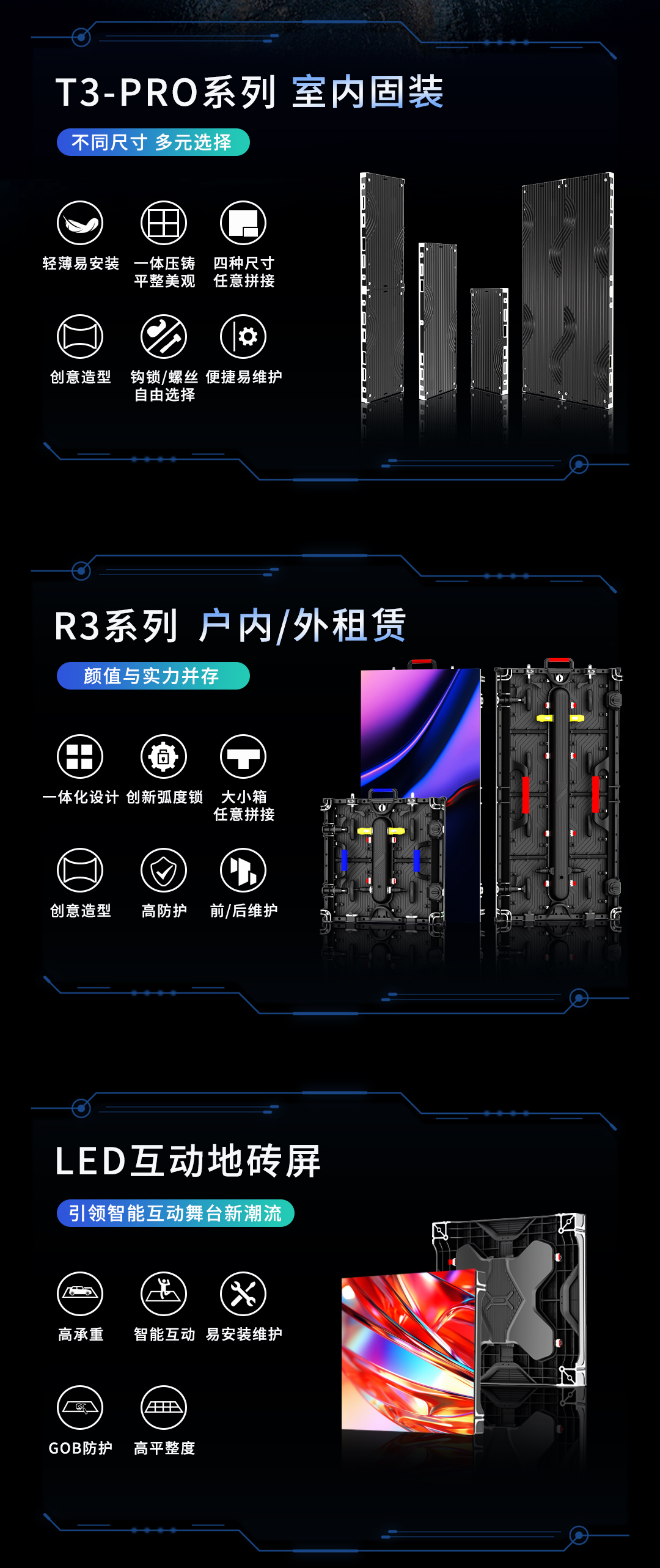聯錦光電的創新力作 T3-PRO 系列室內固裝顯示屏,支持四種尺寸隨心拼接,以百變造型靈活應對多樣化場景需求。R3 系列戶內外租賃屏同樣造型豐富,輕松適配各類活動,其輕量化設計不僅便于搬運,還大幅削減運輸成本與人力投入,為客戶呈獻高效、靈活且優質的顯示方案。此外,LED 互動地磚屏、LED 廣告機等一系列產品,在優化性能、降低成本的同時,為客戶打造出更高效、環保、智能的解決方案,成功引領LED顯示行業技術潮流,推動行業發展邁向新高度。