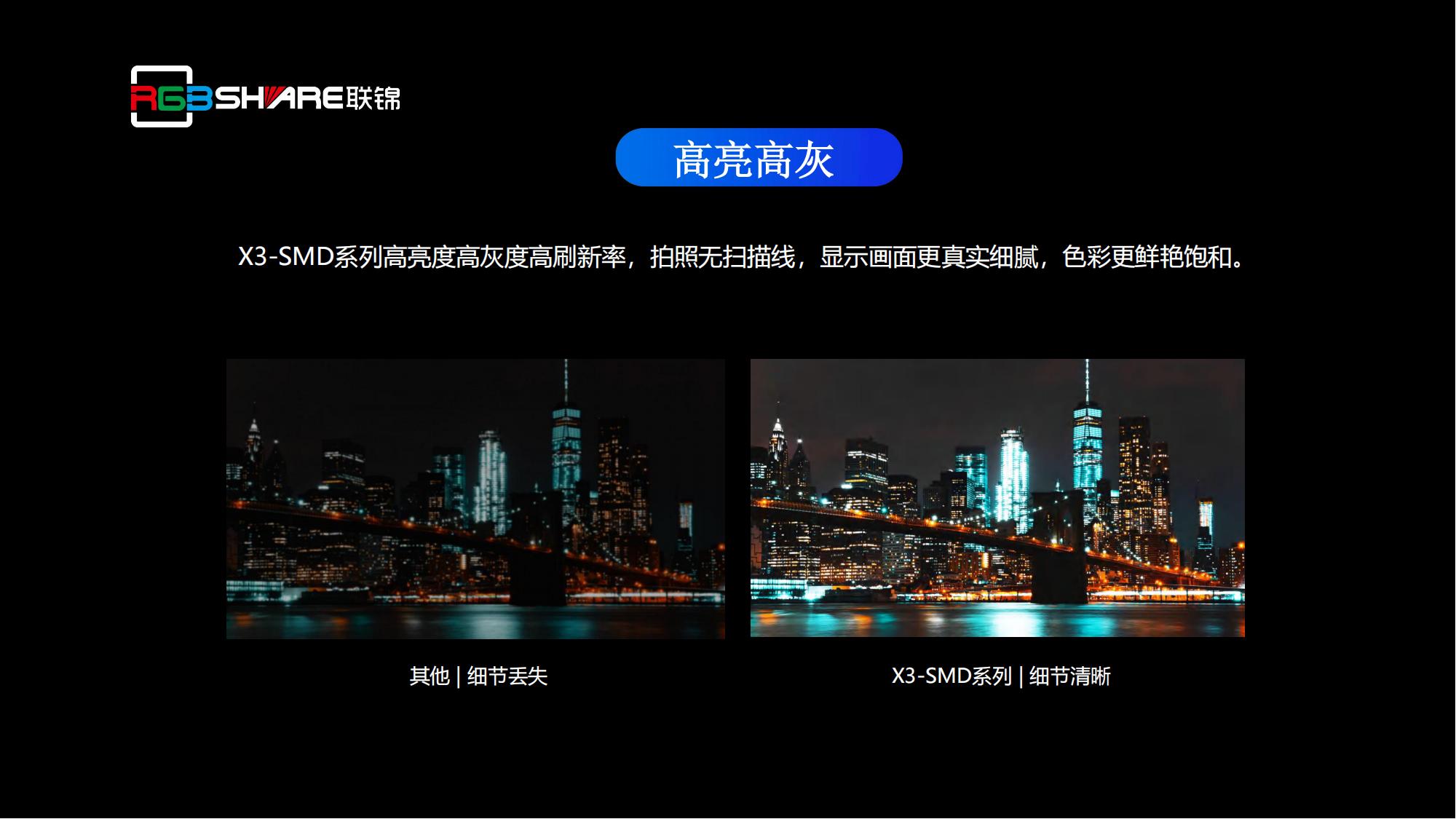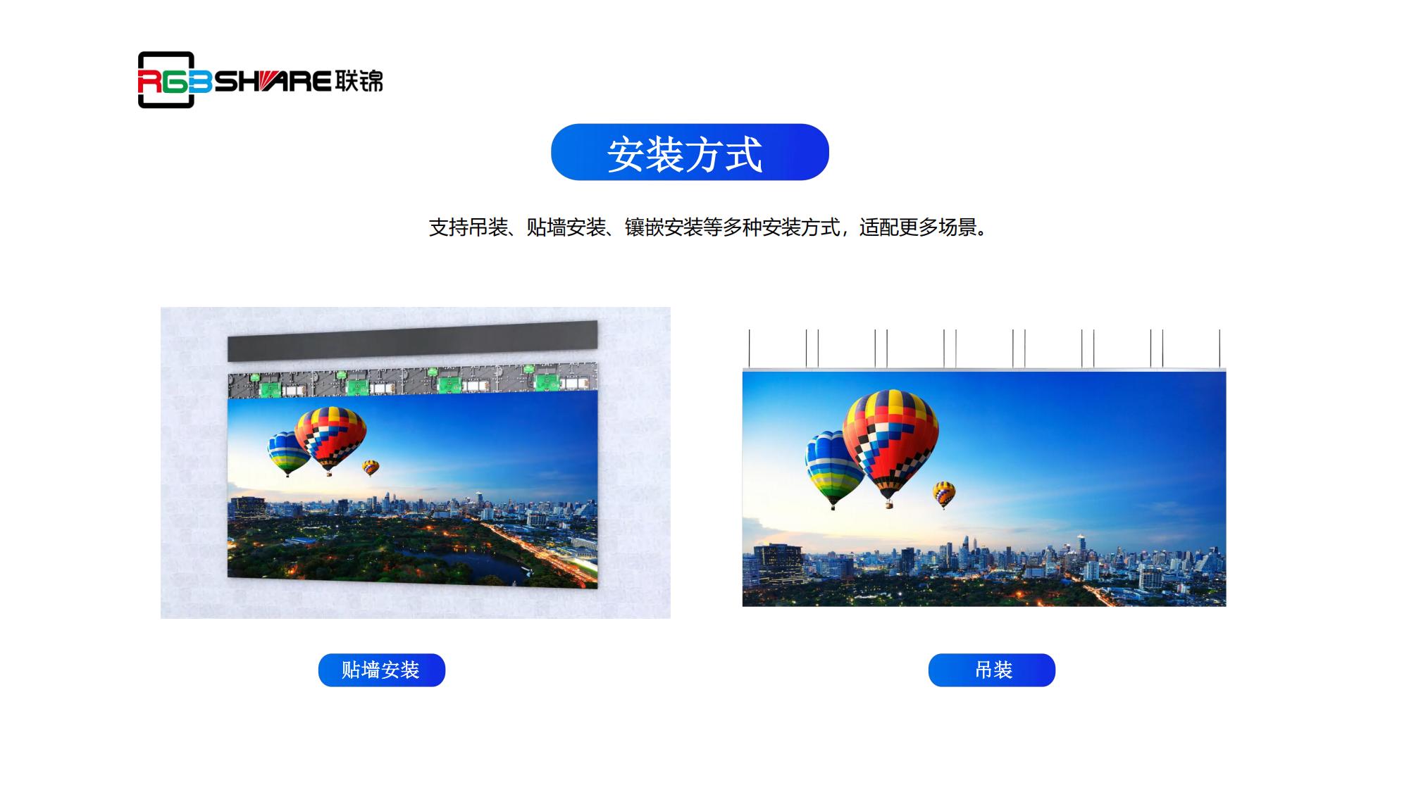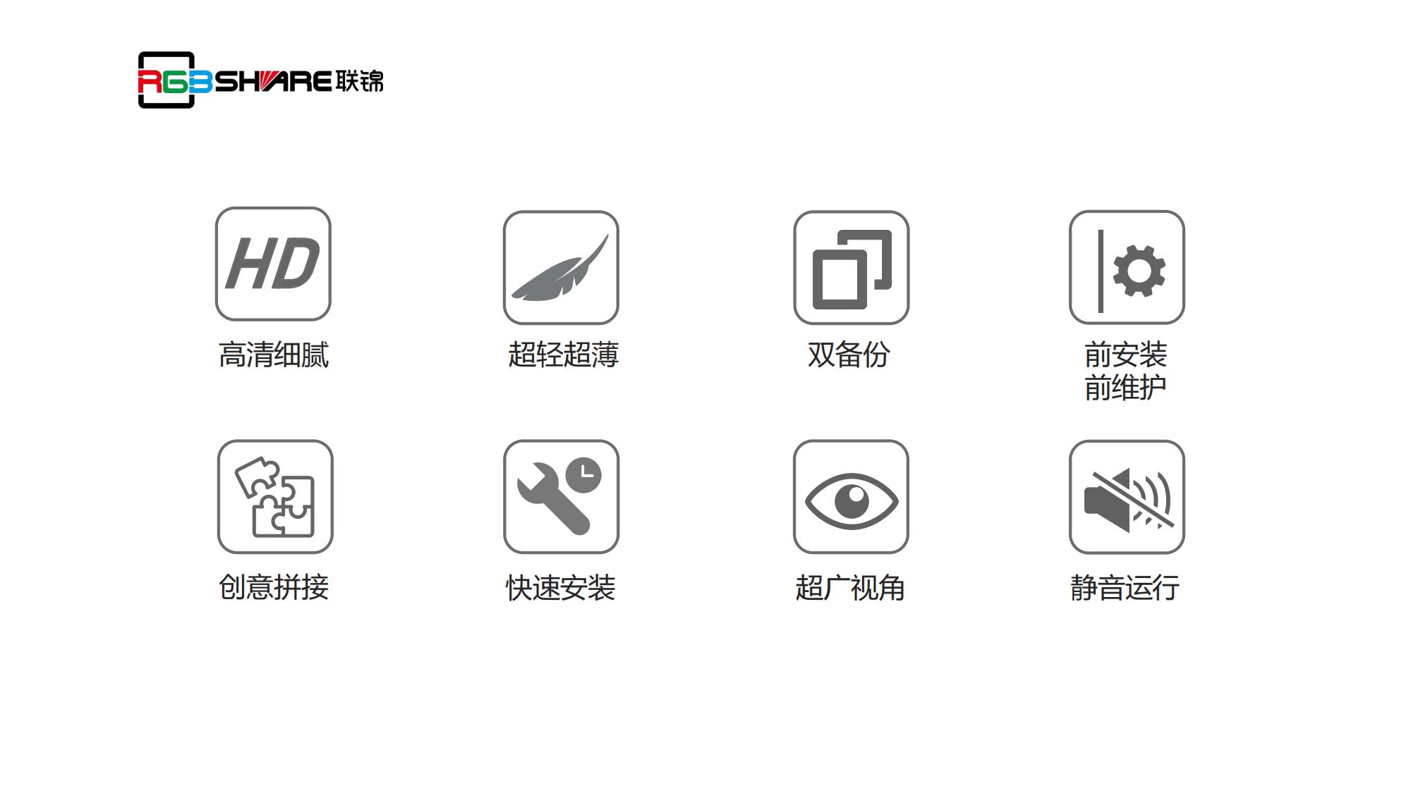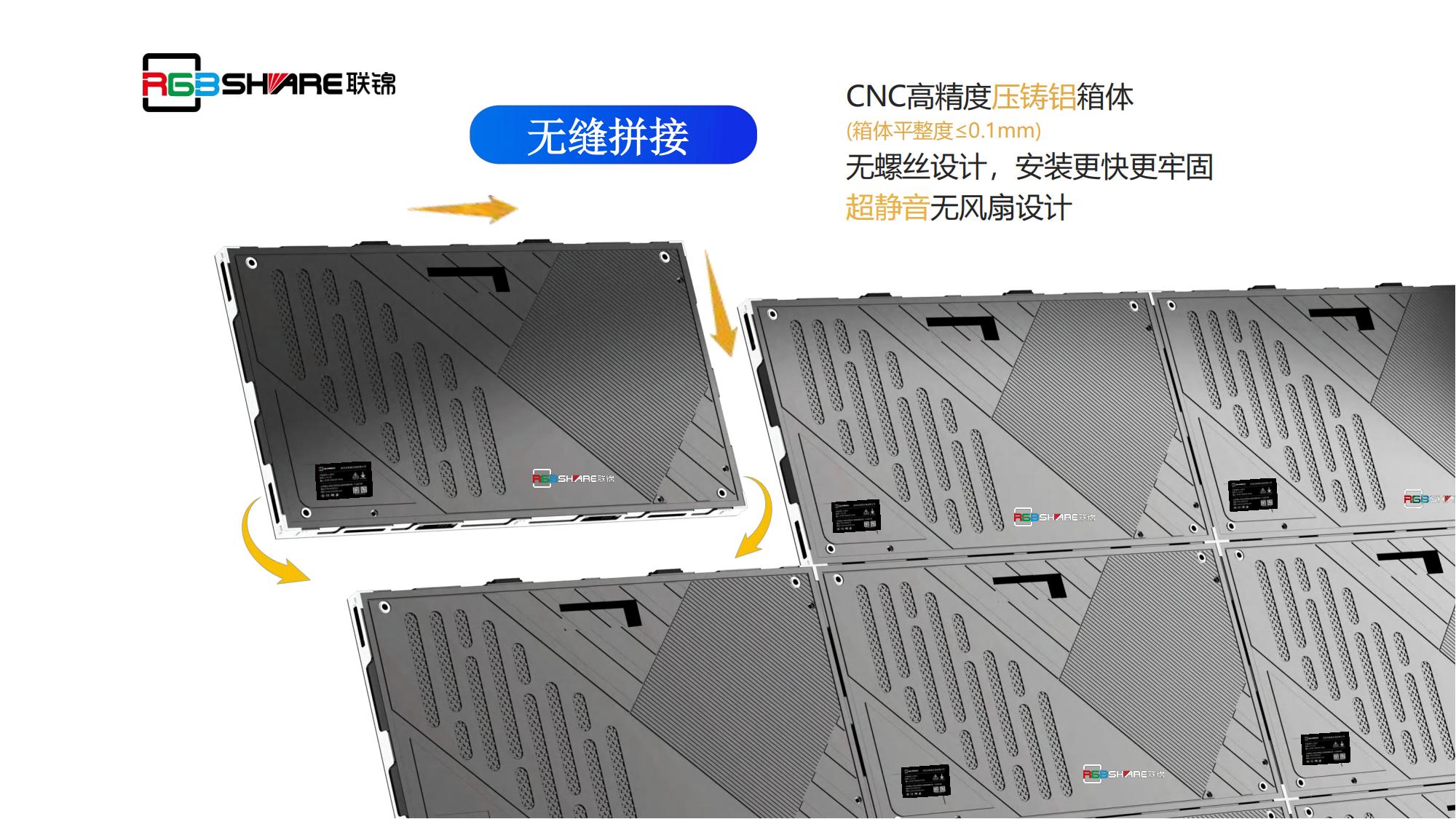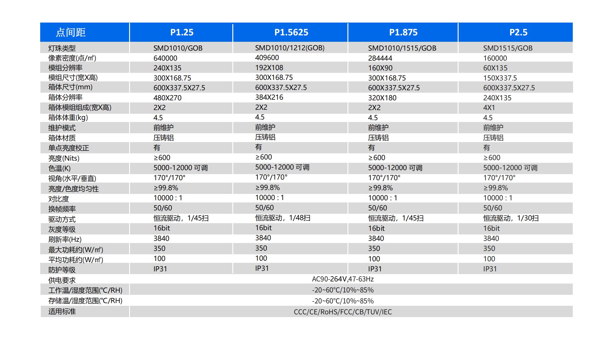 P1.25/P1.5626/P1.875/P2.5 ?超薄,超輕; ?無拼縫、超高清,色彩過度更自然; ?3840Hz超高刷新率,無拖影,暢享高清; ?CNC高精度壓鑄鋁箱體,超靜音無風扇設計; ?完全前維護,安裝更靈活、更便捷。