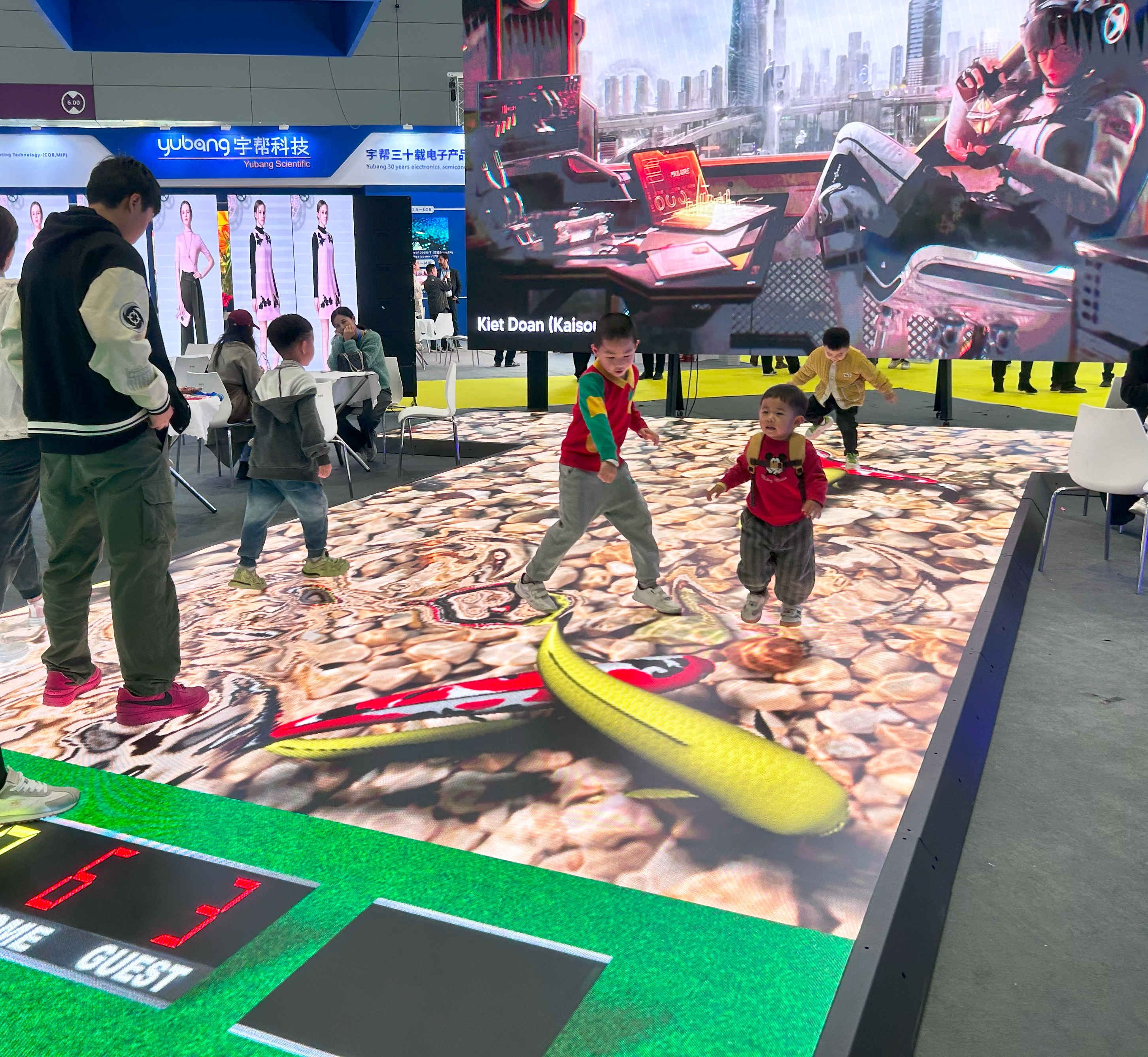 When children play soccer, the screen tracks the trajectory of the soccer ball in real-time, simulating the rolling effect of grass and enhancing the fun of competition; When visitors pass by slowly, koi fish sway their tails and swim leisurely; When running at high speed, the school of fish disperses like being startled, and the real-time generated water ripples resonate with the footsteps at the same frequency, blending reality and virtuality as if walking on the waves. The children excitedly chased after the school of fish on the screen, either by gently moving and exploring, or jumping and chasing, with real-time interaction igniting the excitement of the entire audience.