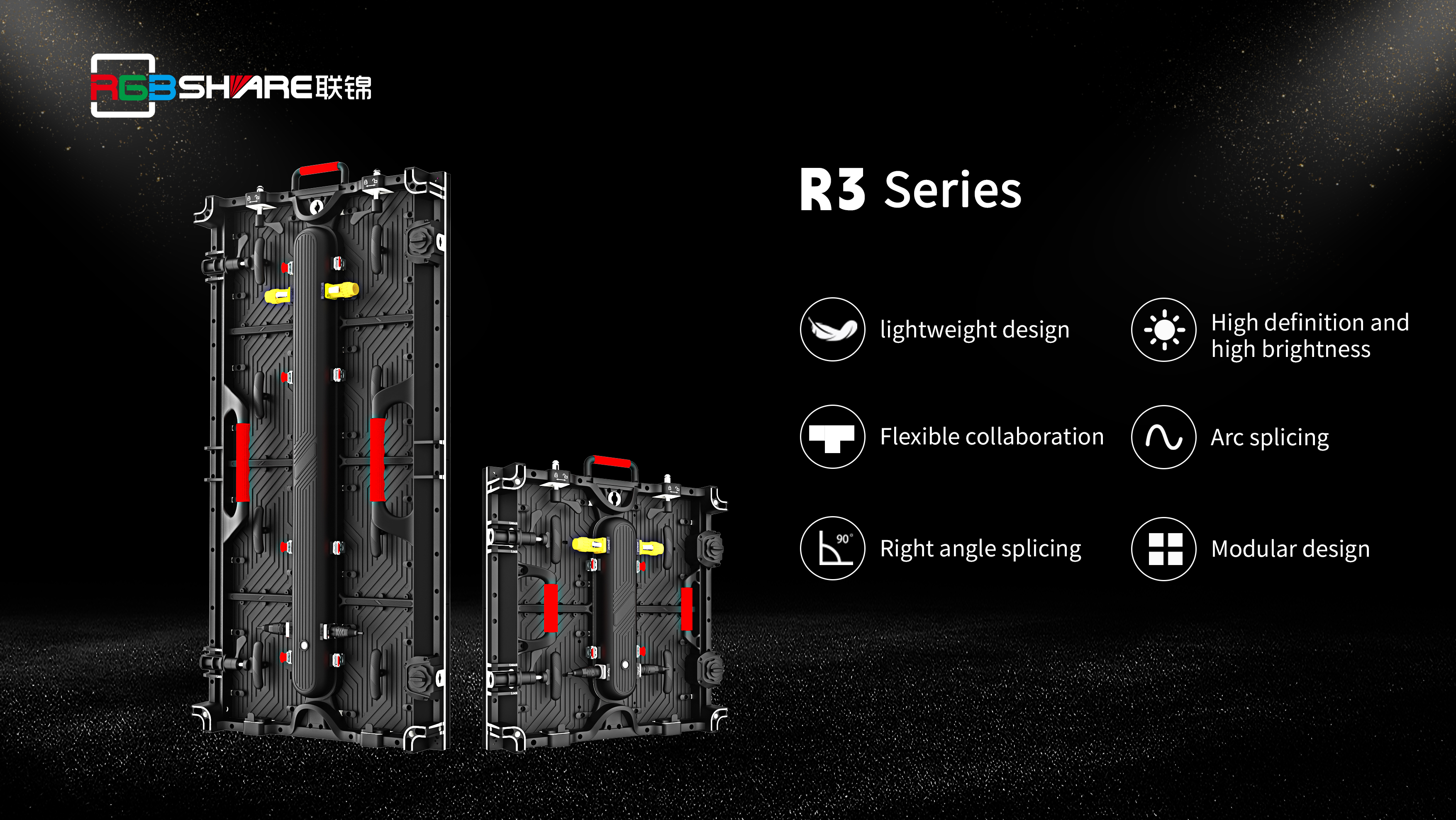 The Lianjin Optoelectronics R3 series rental display screen covers a full spacing product matrix from P1.56 to P5.95, accurately matching the diverse application needs of indoor and outdoor stage rental scenarios, providing rich and diverse display solutions for stage creative design. This series has two sizes of enclosures, 500x500mm and 500x1000mm. Through modular combination design, seamless interlocking is achieved, creating three-dimensional shapes such as right angles and cylinders, empowering multi-dimensional artistic expression in stage space.